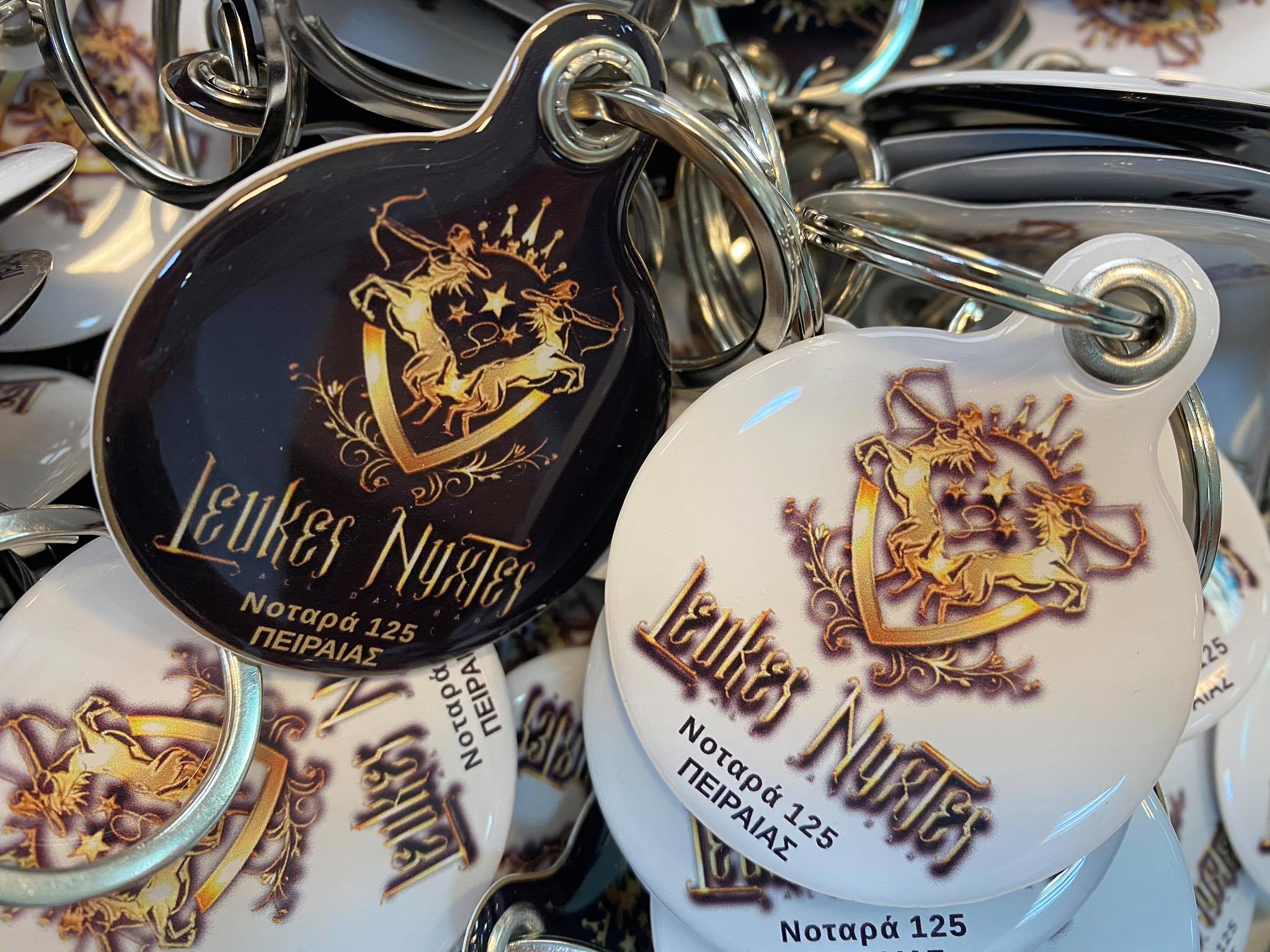 Καθε θαμωνας που θα φευγει απο το χωρο αυτο, θα εχει ένα μπρελοκ σμαλτου μαζι του. Θα του θυμιζει συνεχως τις ομορφες στιγμες που περασε. Γυαλιστερο οπως την ατμοσφαιρα που εζησε, επιβλητικό οπως το λογοτυπο που θα αντικριζει καθημερινα στα κλειδια του, αναλοιωτο οπως οι αναμνησεις που θα εχει. Τα μπρελοκ σμαλτου ειναι διπλης οψης, αναλοιωτα στο χρονο , ευκαμπτα και προσαρμοσμενα σε μεγεθος της χουφτας μας για να ειναι λειτουργικα αλλα οχι μικρα για να διακρινονται ολα τα στοιχεια. Ολα ειναι ξεχωριστα κατασκευασμενα για να ανταποκρινονται στις αναγκες του καθε brand. Mε το δικο του κοπτικο σε καθε καταναλωτη ξεχωριστα.